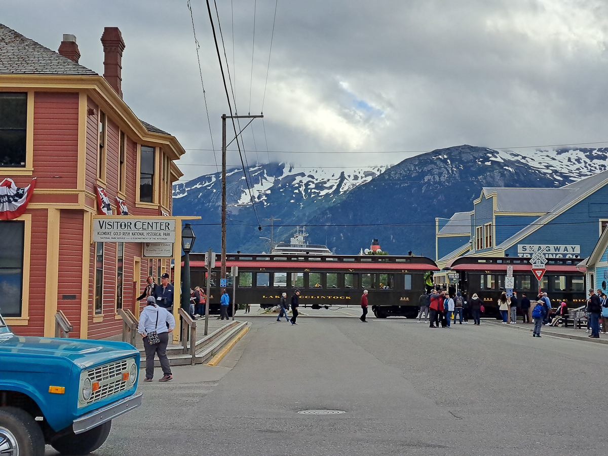 Our route is currently weaving around ticking the boxes of you must see this and must see that.  Skagway was the first of these.  The route down was through more awesome scenery but equally the town itself was of special interest.  We camped at Dyea a small hop round the peninsula from Skagway.  Back at the turn of the 20th century Dyea was a thriving town building up from ‘nothing’ to accommodate the gold rush influx of hopeful prospectors.  There, was the start of the infamous Chilcott Pass route over the mountains en route to Dawson City.  The alternative route, the White Way, was from Skagway through lower land but with thick mud and rivers.  Both routes were extremely hard.