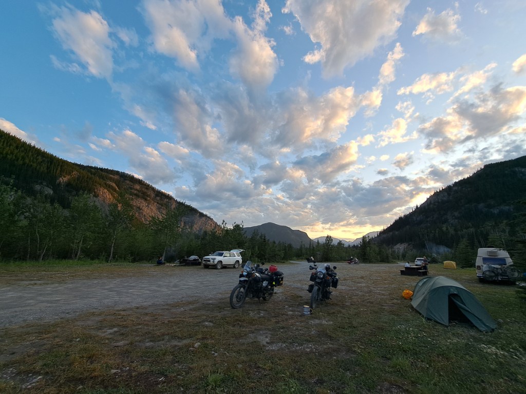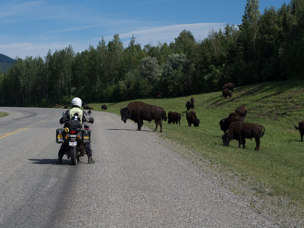 The wildlife has been fabulous.  On this last stretch we’ve only seen one grizzly bear but plenty of black bears.  The black bears are smaller but we’re told, that just means they take longer to maul you to death.  One person is usually mauled every year, Dave in Edmonton tells us.  Erron, a local guy we met at Mosquito Creek campsite added that a doctor and his wife where killed walking out from Banff this spring.  Bears he was telling us, ‘can go from zero to 30 mph just like that.  They are soooo fast.’  Safety around bear strategies include bear bells to ring out ‘dinner time’ and playing dead.  ‘It’s great to practise,’ Larry, at Toad River campsite, laughed, ‘because you soon will be’.  Studies have suggested that the machos who carry a gun will be too slow to draw and aim it.  So it’s bear spray, the counter attack, or nothing.  The bison along the Alaskan highway were beautiful too, all recorded on GoPro video. A few deer have also skipped across the road ahead of us. Two bounds and they’re gone.  But the one that got away was probably the most spectacular.  It started as a small dot.  Our first thoughts were could it be a bear.  ‘No!  It’s flapping and it seems to be two small dots’, I exclaimed.  It could be something blowing in the wind but road tyre debris doesn’t flap and is too heavy to blow in the wind.  Slowly it revealed itself as two birds.  Ravens probably, there’s quite a few of them around.  Nooo!  One of them has a white head.  All too late to start the GoPro it flew up from it’s road kill meal swooping right across our path – a beautiful full wing spread of a bald eagle a few metres in front of us.