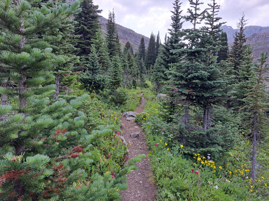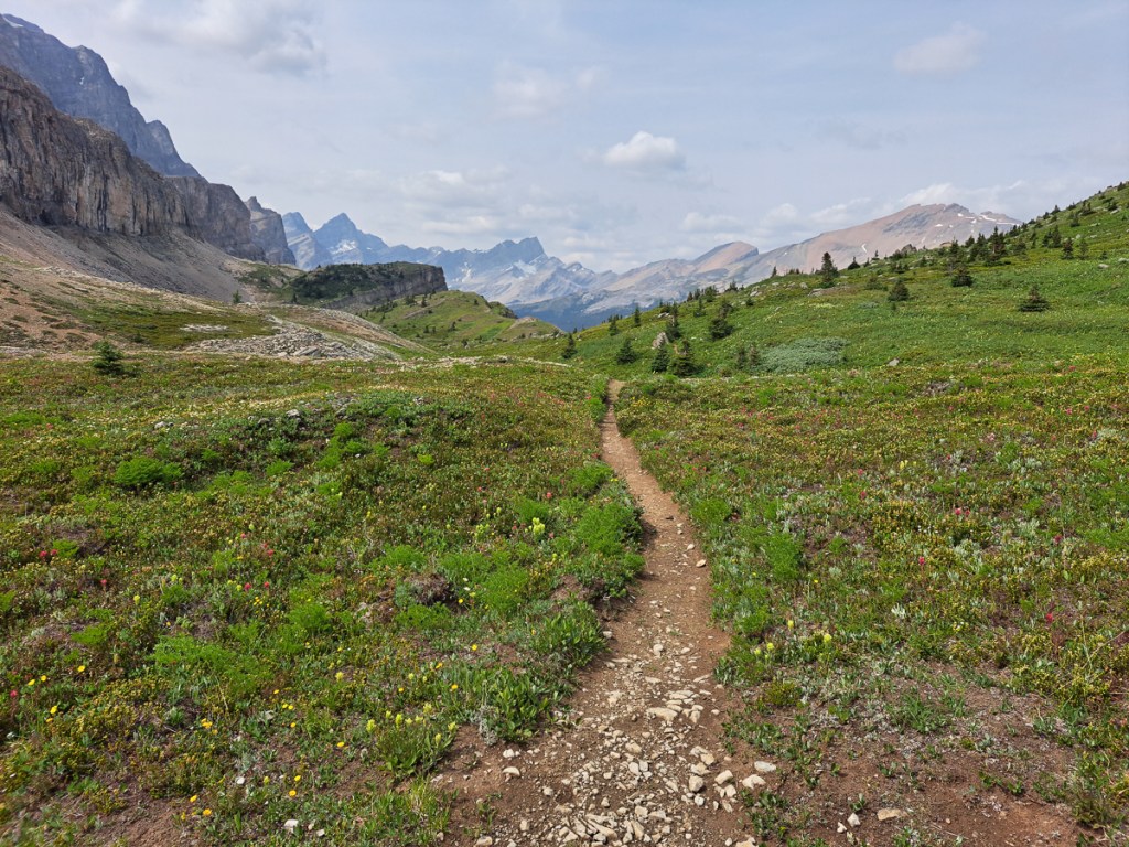 We climbed up, frequently crossing the creek. We were surrounded by mountains, towering up above us.  And spruce trees.  We were expecting meadows, which were referred to on the information boards at the start of the trail, but every new view seemed to meet and exceed our expectations.  Simon armed with binoculars stopped regularly to spy for wildlife.  Once we broke free of the tree line and cut across the stony track at the head of the valley again the views were breath taking.  On we went imagining that we’d seen the best.  How wrong could we be.  Eager to go just a bit further we continued on.  The top flattened out to the most amazing meadows.  Trumping that was the golden eagle that flew just a few metres above the meadows in search of ground squirrels 30m or so to one side.  I had only just said, ‘With so many ground squirrels where are the birds of prey?  You can’t have one without the other!’  This spectacular bird soared through.   It looked rather black I thought for a golden eagle.  Golden being the key word.  The following morning Simon brought his book of North Canadian Birds.  There it was pictured, the golden eagle – black, in the mountains (seen at over 2200m it ticked that box), solitary, lives on ground squirrels etc, nests in the mountains.  It certainly was a golden eagle!