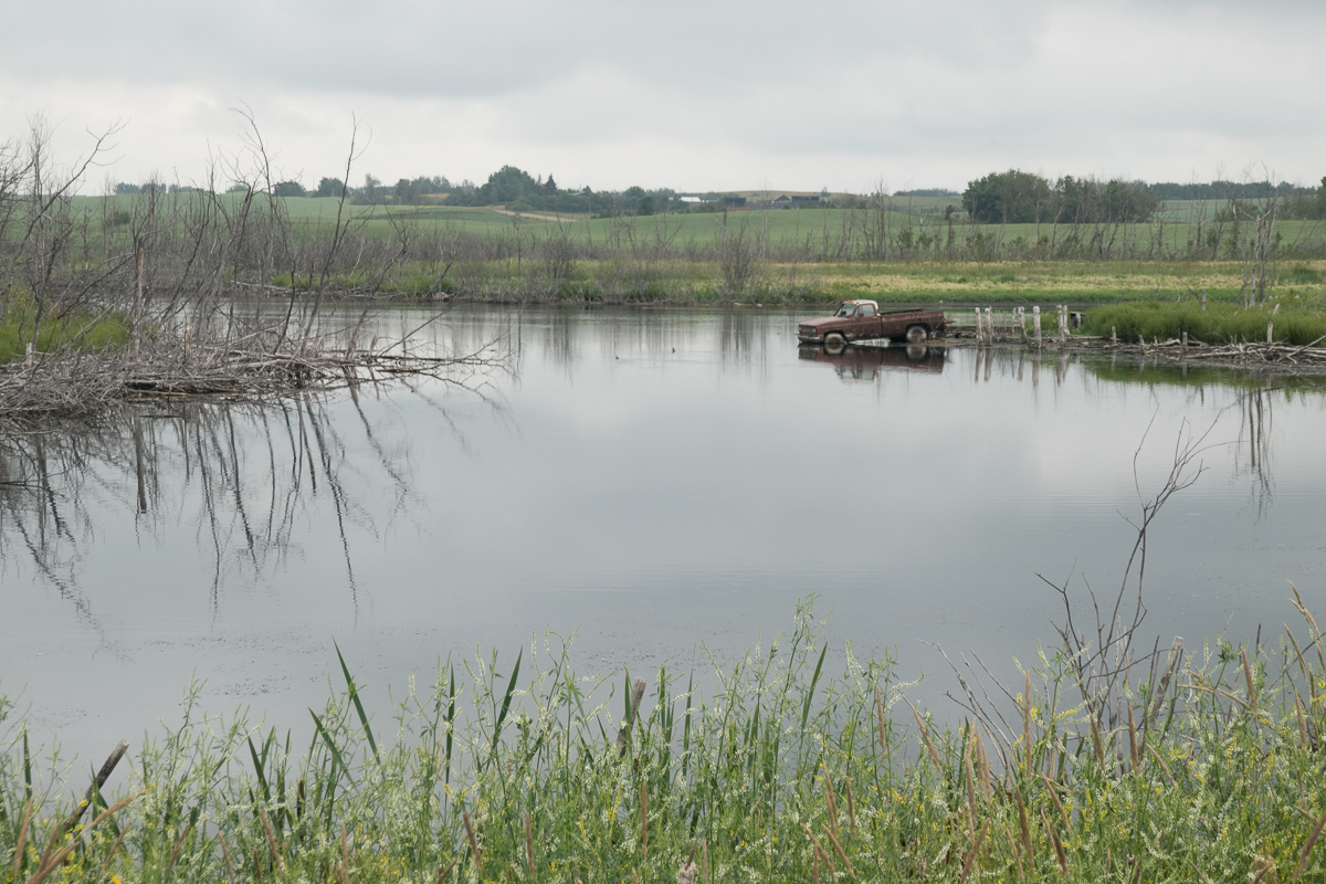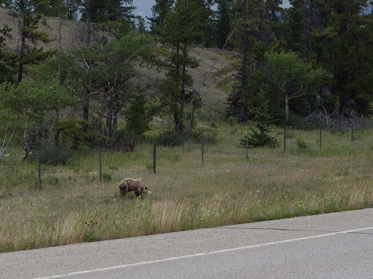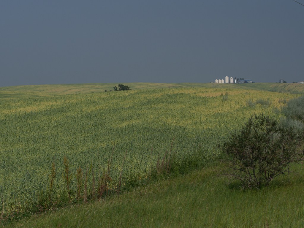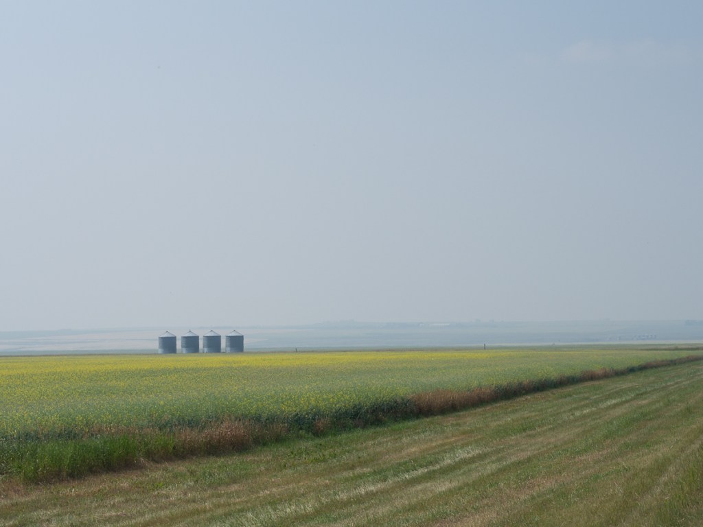 The views have been staggering.  Riding east into the Yukon on the Alaskan Highway led to spectacular panoramic views as wide valleys opened up.  Flowers edged the road side, rivers meander across the valley floors.  The only thing missing was the sheep alluded to on the signpost.  We went from the snow topped mountains of Alaska into the more rolling, greener, countryside of the Yukon and the change was refreshing. A short leg in BC was even greener, and now we were seeing small scale agriculture, too. Continuing on from BC into Alberta the mountains had gone replaced by expanses of arable land.  Hay bales in one field a tractor ploughing the next. Initially they were quite small but soon spread to a considerable expanse. Nearing Edmonton, prairie farms started to appear, miles upon mile of crops, mostly mown hay, rape (canola) and barley, but also oats, wheat, linseed as we turned south. And every second field had a nodding donkey extracting oil.
