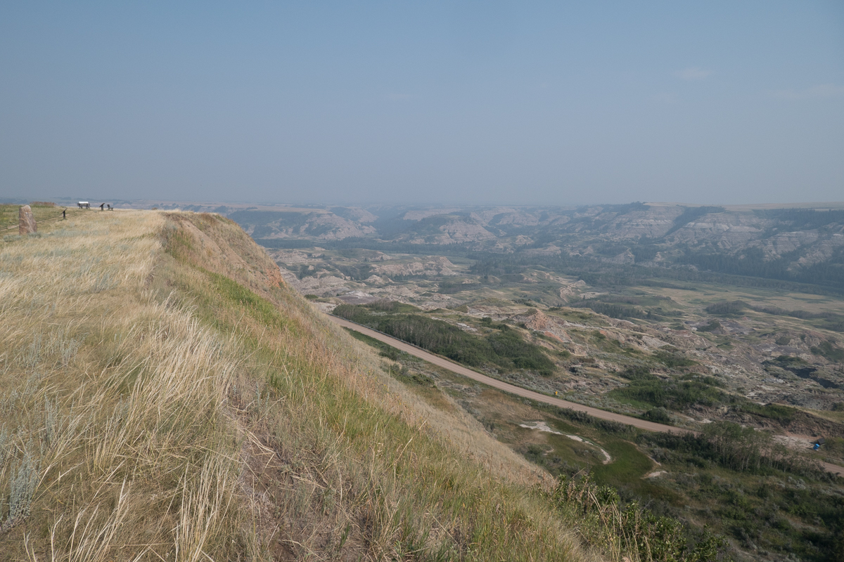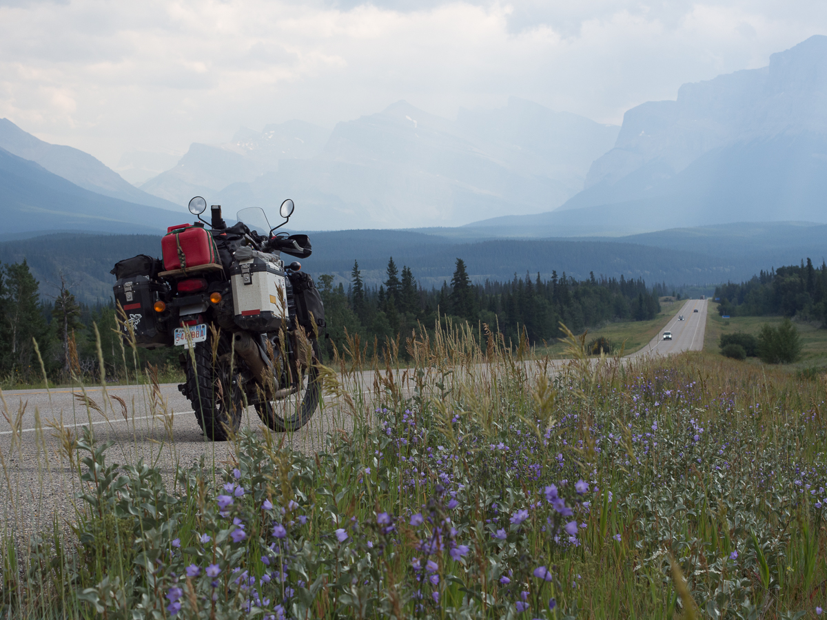 Having ridden down Hwy 21 where we enjoyed the delightful lush rolling pastures of the prairies and visited the tourist attraction Dry Island Provincial Park where the buffalo/bison were herded over the top of the cliff, we yet again, cut back westwards.   We did however manage to ride over the Saskatchewan Pass on Hwy 11 linking Hwy 22 with the midpoint of Hwy 93.  It was initially very unclear as to whether the junction would be open to traffic.  Thankfully, closed down Jasper was some way north on and we were able to turn south, after being royally shafted by the gouging prices at Saskatchewan Crossing.  (A micro can of gas cost us £15).  Along the linking pass towards the Jasper end was another interesting study of forest fires.  The ground in one area of thinned out burnt spruce had a magenta hue – fireweed was doing its rejuvenation job, while in the next 10 to 20 km there were areas with green 1m high trees, 2 m trees etc. clearly demarking the zones of previous fires and the progress of regeneration.