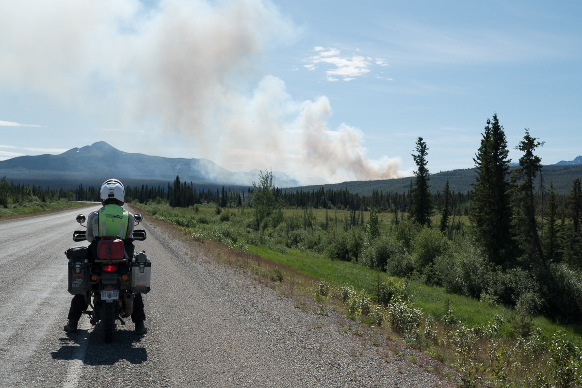 The temperatures of at least 10 degrees higher than normal have caused havoc with forest fires in the north of Canada.  In the Yukon the fire between Dawson City and Whitehorse was still an issue three weeks after we initially heard about it.  Canoeing races down the River Yukon had been stopped because of fire sweeping across the river.  Riding across BC we’ve seen evidence of fires with mountain views being obscured and that distinctive bonfire smell in the air.  At Johnsons Crossing the campsite owner dismissed our inquiry about safety saying, ‘Yer, there’s a fire. It’s down the valley and across the river so won’t affect us here.’   It’s great to have something other than bears to worry about at night.  As we rode further on again the tell-tale smell was still in the air, smoke was wafting across the sky line to our left but on the right smoke was billowing up into the sky.  Getting closer we could see one helicopter with a water bomb and two small aircraft circling in the area.