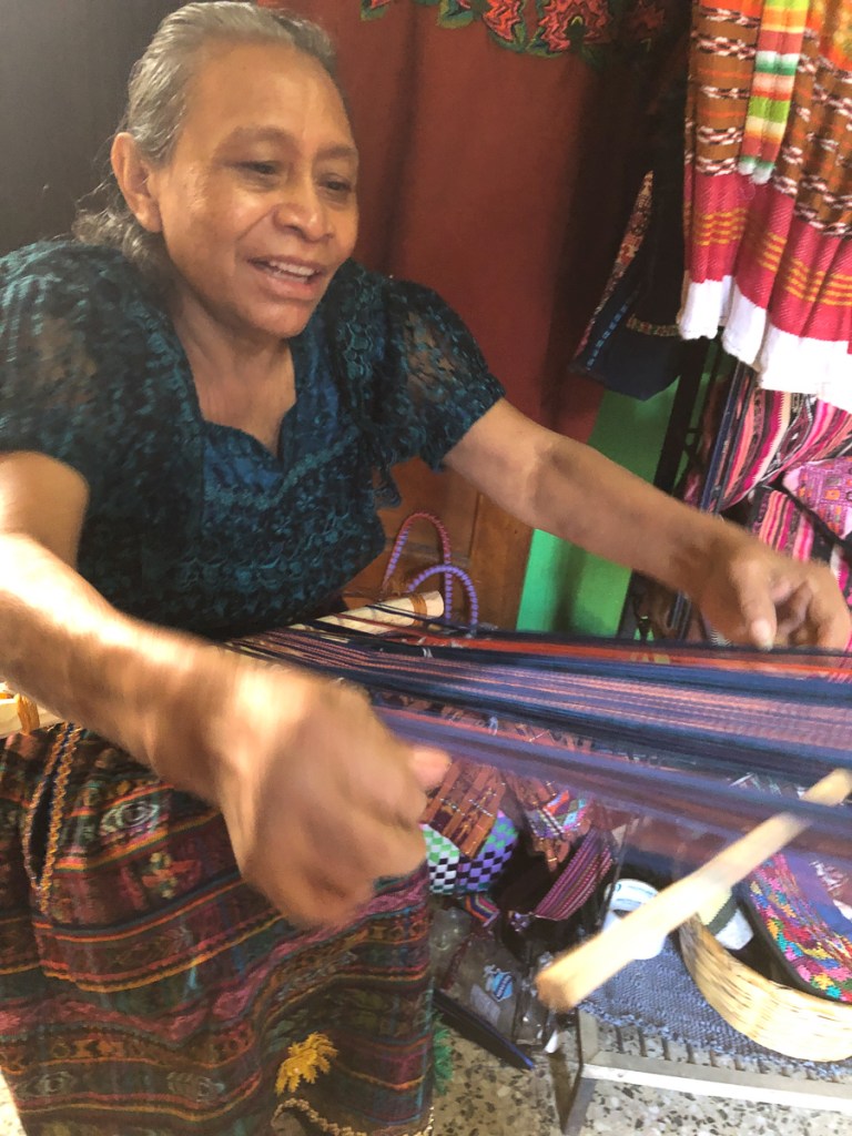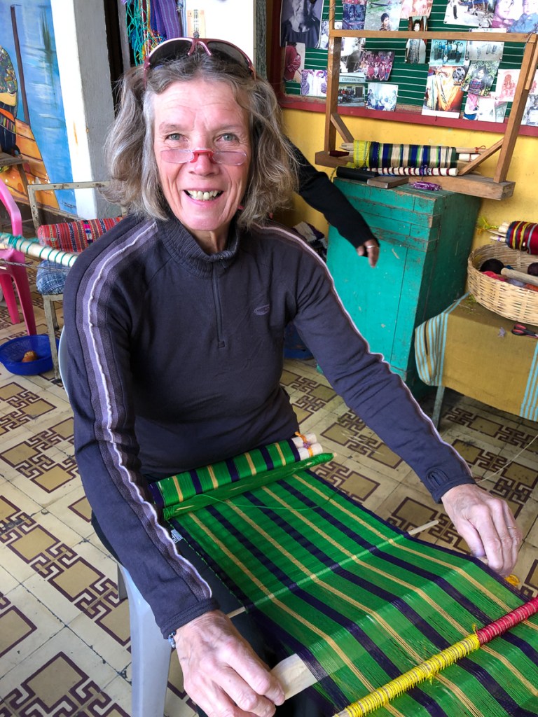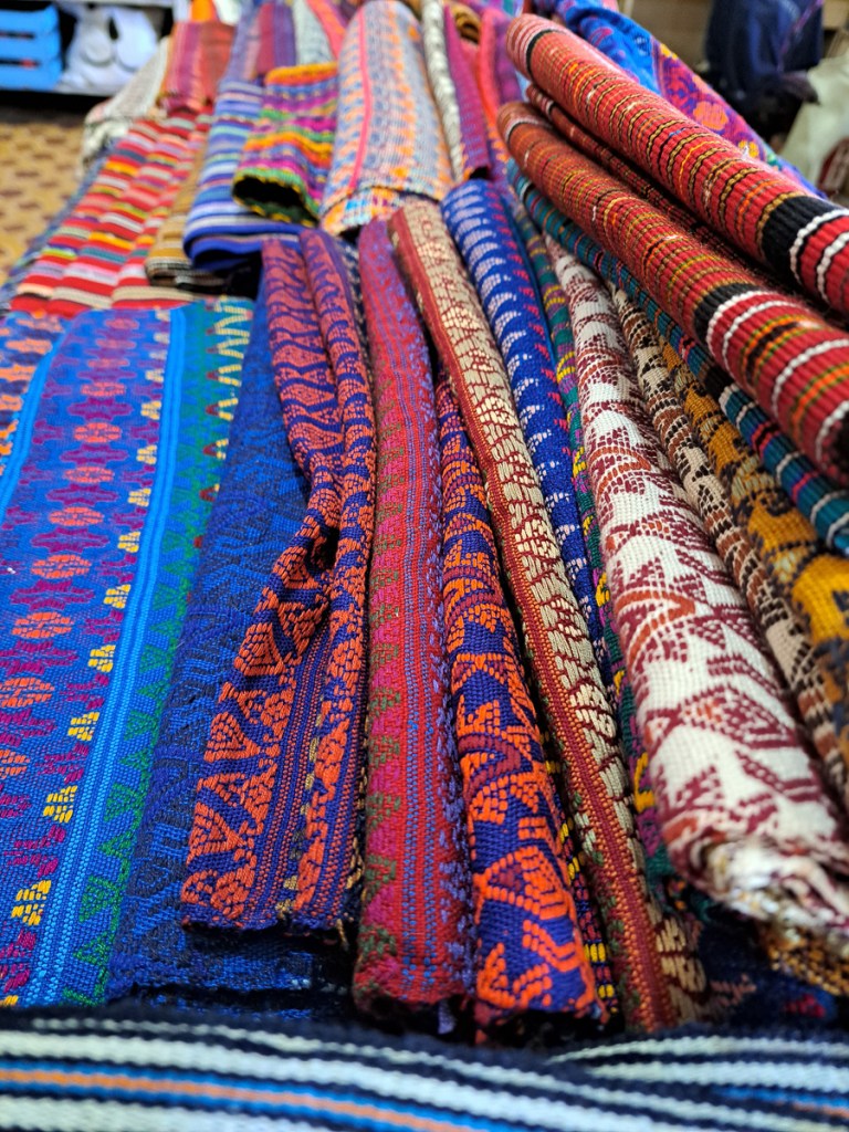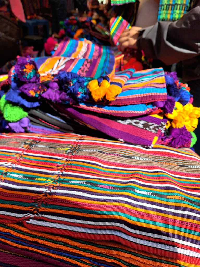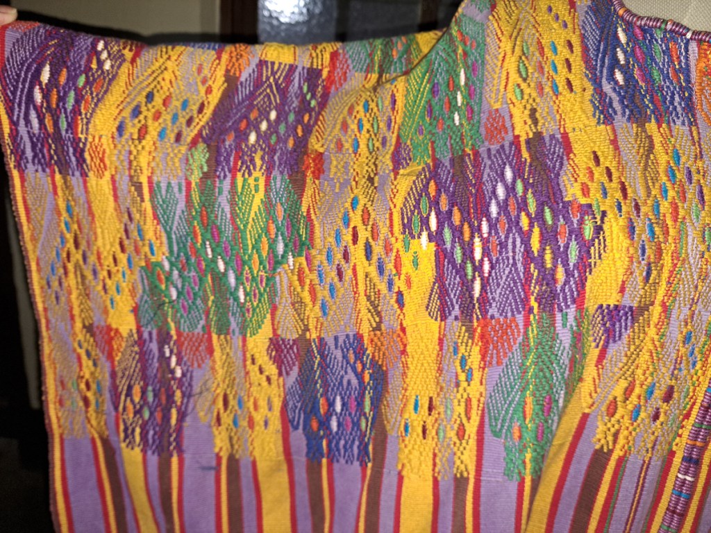Another attraction of Xela was the presence of schools of traditional backstrap weaving. A taster session as a part of our language course was all it took – Clare was going back for more. Another week in Xela. I continued with 4 hour Spanish lessons, Clare cut down to two, and spent long mornings and late afternoons in the weaving school. By the time we left Xela, we were loaded down with: