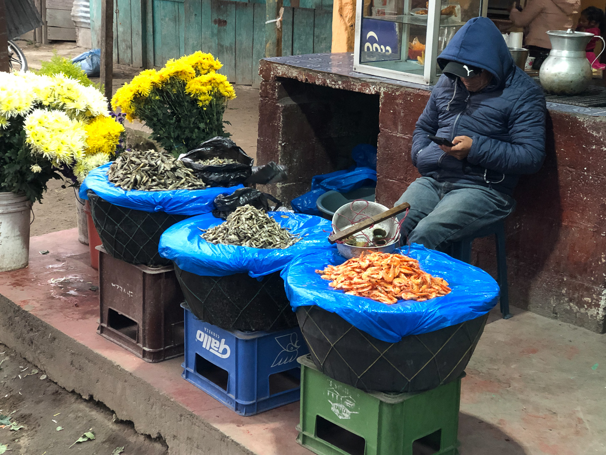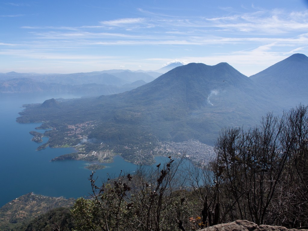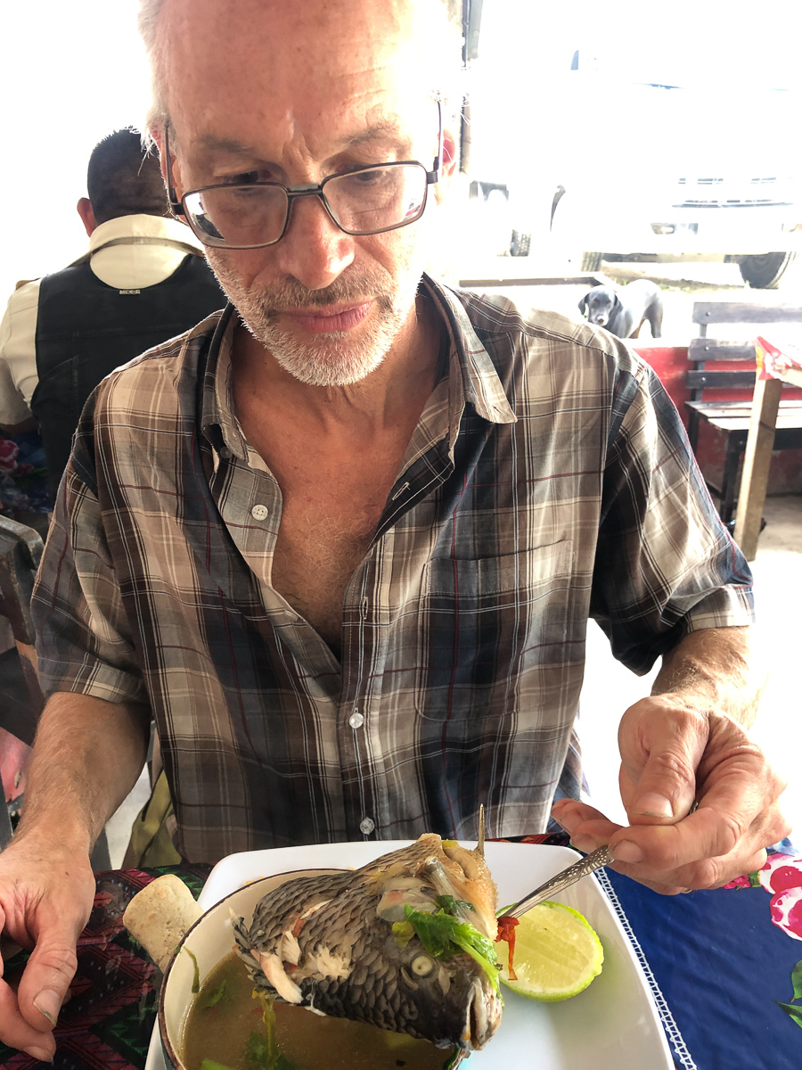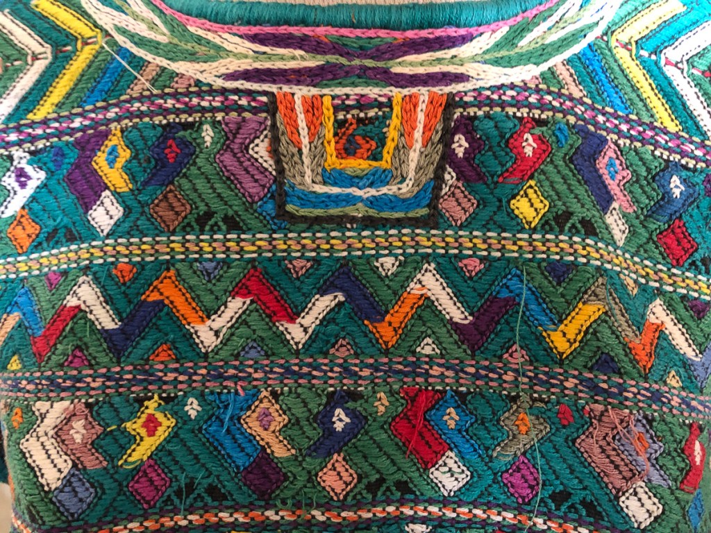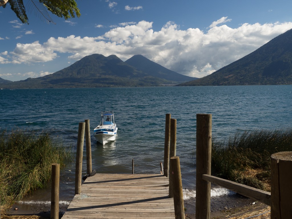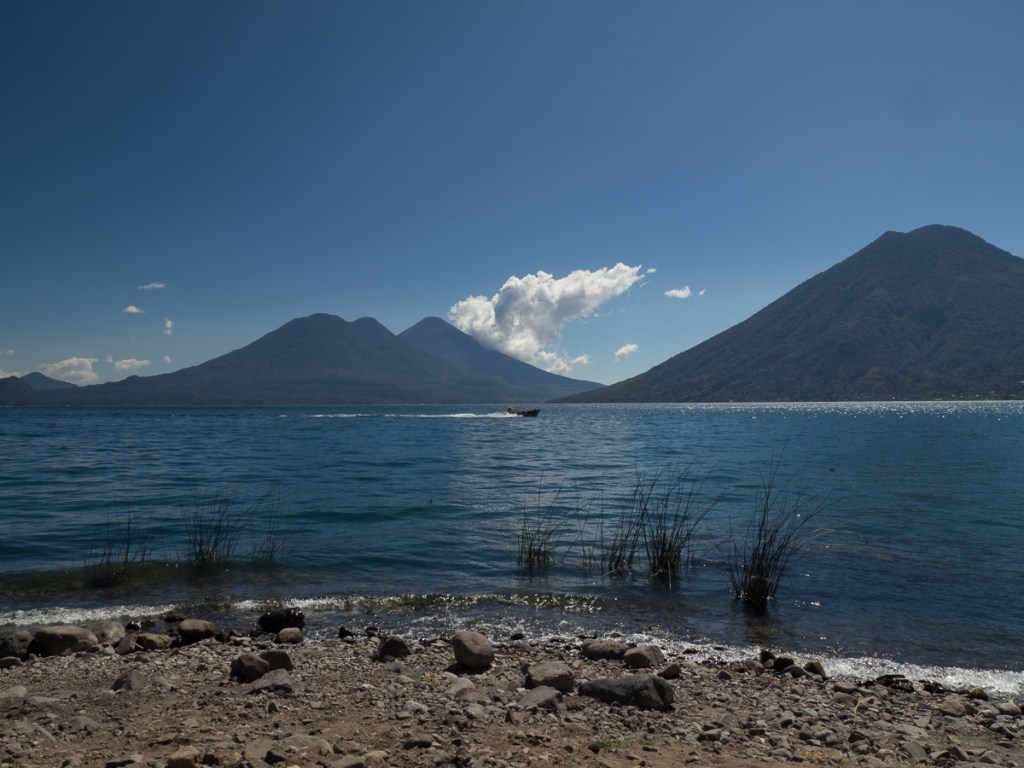 The wait for the courier opened up the perfect time slot to visit Lago de Atitlan. It was maybe half day’s ride away, so an visit. As we approached the famous lake, we stopped at a mirador (viewing spot) near the top of the mountains surrounding the lake. I had looked at the map and knew there were habitations around the lake but was expecting a few villages dotted around the shores. I was horrified. It was so built up! Creeping down the endless tight hairpin bends kept us very focused on the road. Emerging into the cobbled streets of the town there were the familiar highly coloured murals adorning many of the walls juxtaposed with wrecks and rubbish abandoned along the way. Town dogs mixing it with traffic, tuktuks filling every possible gap while Mayan ladies wearing their tradition costumes, baskets on their heads, boldly striding down the streets set a more appealing scene. The roads, we learnt later, are one of the three prime uses for the volcanic rubble which accounts for the random cobbles.