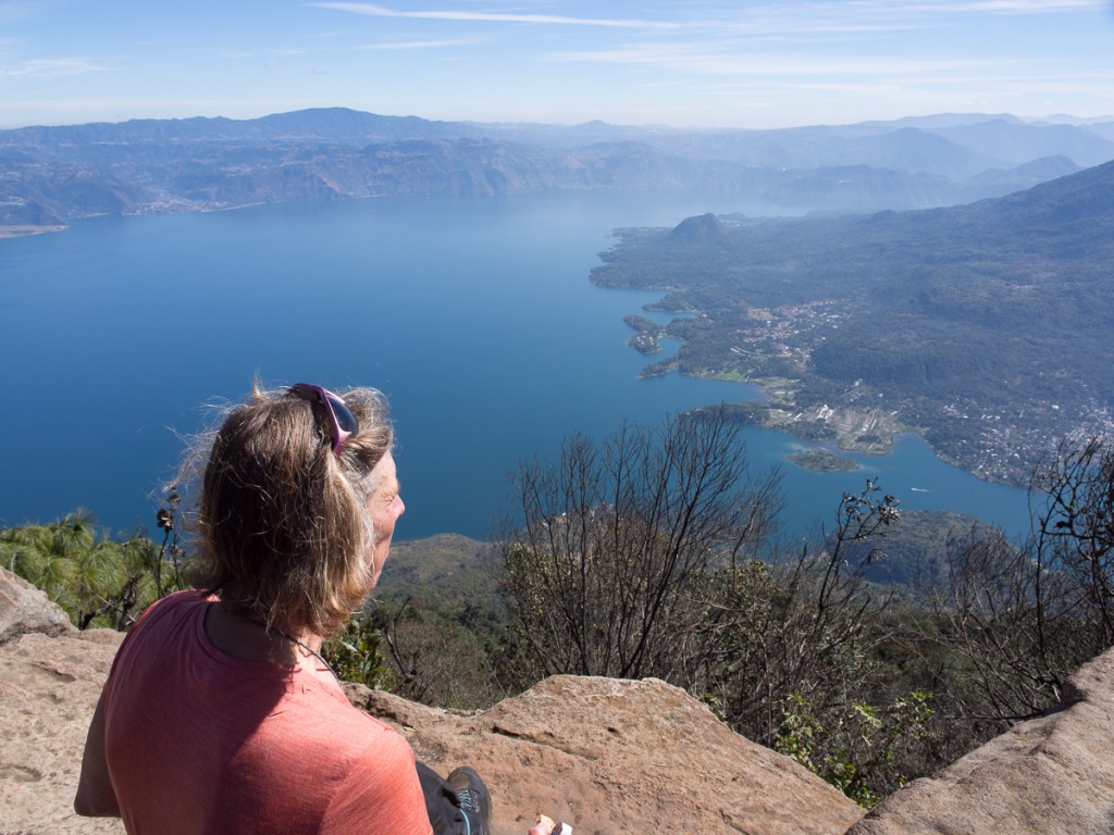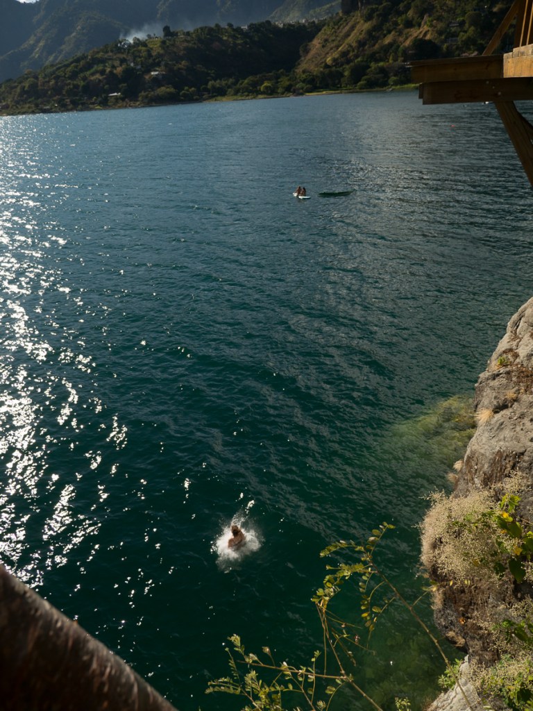 We trundled along San Pedro main street eyeballing possible hotels – could that alley allow us to ride our bikes right into the hotel? I scouted on foot. Sure! Park amongst our family bikes the friendly owner, well, gestured mostly, to be honest! The hotel had the requested lake view if you poked your head out of the door but even better was our easy access to the water across the road. Atitlan is a swimming lake we’d been told. It didn’t take us long to head off down the opposite passageway to assess it. Sharing the path with a deep ‘road water’ run off channel was the first dodgy point but on reaching the lake the piles of rubbish, and locals washing themselves, their laundry and crockery was enough to quell our desire for a dip. A couple of days later however when visiting San Marcos, a small hippy hamlet on the opposite shore, famed for its jumping platform, it had to be done. That activity also showed us where all the young male tourists were, to complement the young women prowling the tourist stalls and cafes. We were definitely the oldest jumpers while we were there!