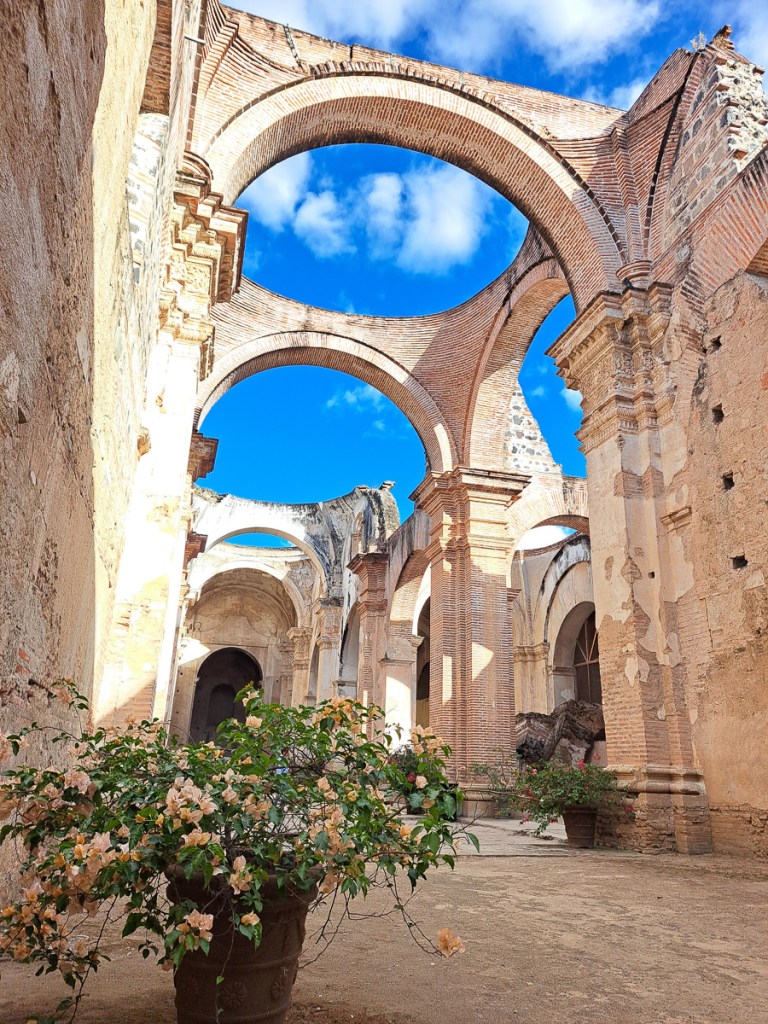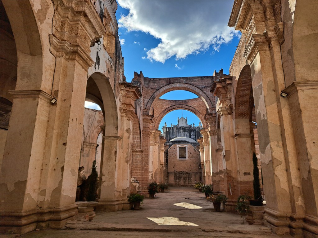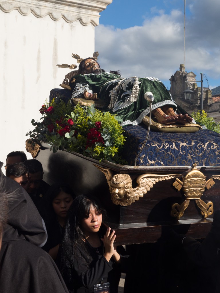 Antigua is a must see in anyone’s book. A UNESCO listed ancient capital city overlooked by menacing volcanoes has numerous ruins following a series of eruptions & earthquakes over the centuries. In 1773, then the capital of Spanish Central America, it was shaken to the ground and the capital was moved, taking the name Cuidad de Guatemala with it, and bequeathing the name Antiqua Guatemala to the ex-capital. Antigua has numerous respectfully painted one storey buildings lining broad cobbled lanes. As a UNESCO city there are very strict rules as to what is acceptable and no advertising slogans disfigure the walls. One has to pass a building and peer in to see what is sold. Open spaces were crowded with street sellers, musical performances and a few omnipresent beggars but pavements themselves were oddly devoid of café furniture and sellers. A procession in connection with the build up to Holy Week took place at the old cathedral. These processions gain in momentum up to Easter Week when the streets of Antiqua are blocked. During the Easter festival the streets, which criss-cross the city, will be lined with flowers and relics from the biblical scenes.
