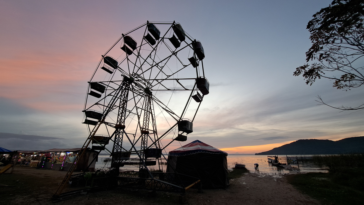 Clare: The first tourist spot heading into Guatemala from Belize is the Mayan site of Tikal. We were both feeling rather pyramid puffed and ruins’ed out but it had to be done. Tikal itself has just a few expensive holiday apartments, way above our budget, so we cruised up and down for accommodation in the nearest village of El Remate. Bingo! A nice little local non-internet hotel. Even a swimming pool it boasted. Pool there was but rather small and murky so neither of us jumped in. As accommodation goes it was fine by our modest standards, friendly staff, bikes parked right by our window, and the gate closed overnight, a roof terrace for a bit of gym. It was new year’s eve, and a fair was in town – Gid took a few sunset pictures, but we both conked out before midnight.