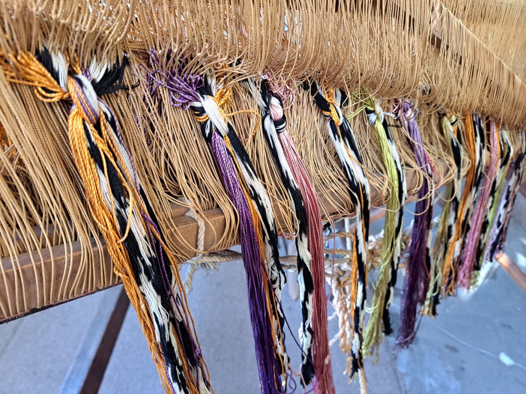 - Scarf #2 on its portable loom of sticks and string.