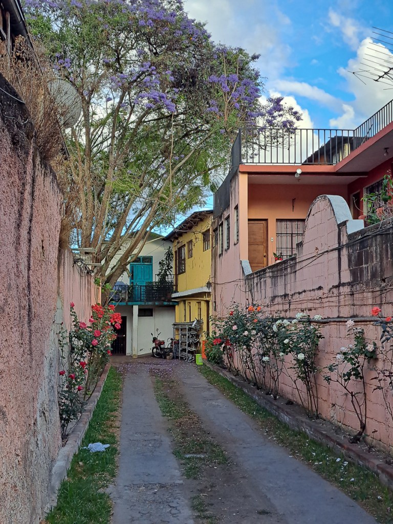 While idling in Flores (Clare had a grotty cold), we’d realised that we’d dropped into a rather tiring pattern of riding for a day or three, arriving at some tourist site and “doing” it, then moving on. Although it broke up the riding, it was pretty remorseless. Whereas when we cycled 2016-2018, we’d ride for several days, with odd rest days, then stop for a few days in an interesting place. That gave a time for a real break. When cycling, the physical break was more appreciated, as churning out the miles, if not too gruelling, is mentally relaxing, but the legs, shoulders, bum suffer. Whereas on the motos, usually the riding isn’t physically demanding (no iron-butt rides for us), but the constant enhanced alertness is very taxing. We decided to change. Lonely Planet suggested Xela was a great place to sign up for Spanish lessons with an immersive homestay. At the last minute, over the weekend, we booked with El Quetzal Escuela de Español!