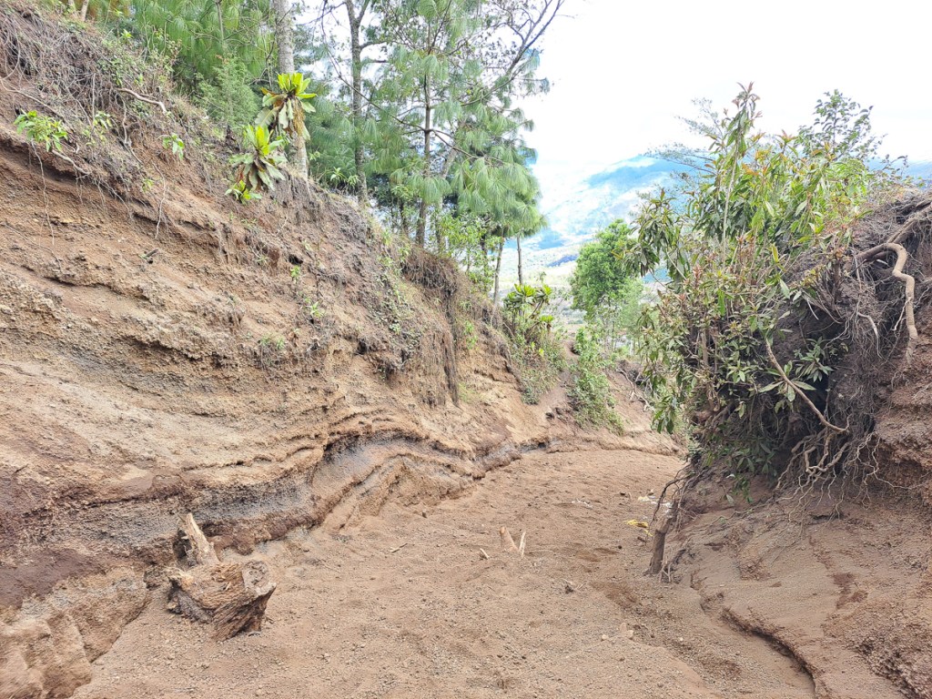 The following morning we made it up to the top. Not quite in time for the sunrise but we still had plenty of low light views. We had decided to have breakfast before leaving camp and taking all our kit so we could continue on our downward route from the top. This would enable us to take a less populated route down, and see different views. After a quick lesson in scree running down a mountainside we bounded down. The volcano’s outer layers are made of volcanic ash and ejected rocks, it’s very fertile for plant life, but also very uncompacted. At times the trail was eroded 3m into the soft surface – the trailside clifflets showed all the layers of successive events. The technique changed to little tip-toe steps down the steep loose sandy gravel. With only one slip between us both proved successful. There are some remarkably dramatic or epic youthful tourist (influencer?) descriptions of the hike online – it’s perhaps a lot harder wearing the wrong footwear whilst trying to Instagram at the same time. While we were both pretty knackered by the end, we weren’t as broken as after the easier San Pedro hike – the training, new boots, and toe care had paid off. In addition, Clare shrugged off a nasty attack of dodgy tummy that she had at the base camp.