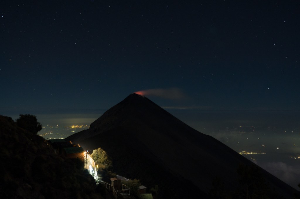 Luckily, girls in our neighbouring hut at the top of the mountain discovered that whilst we couldn’t see any glowing lava with the naked eye that night, cameras and phones could long-expose a red peak (they’re probably more sensitive to infrared than us). During the afternoon we’d been watching steam trails wafting up so knew something was happening. The night before, at 1:15am or so, a tremor had shaken our hotel bed in Antigua, a morning Google said it was 5.5 on the Richter scale. Something was occurring.